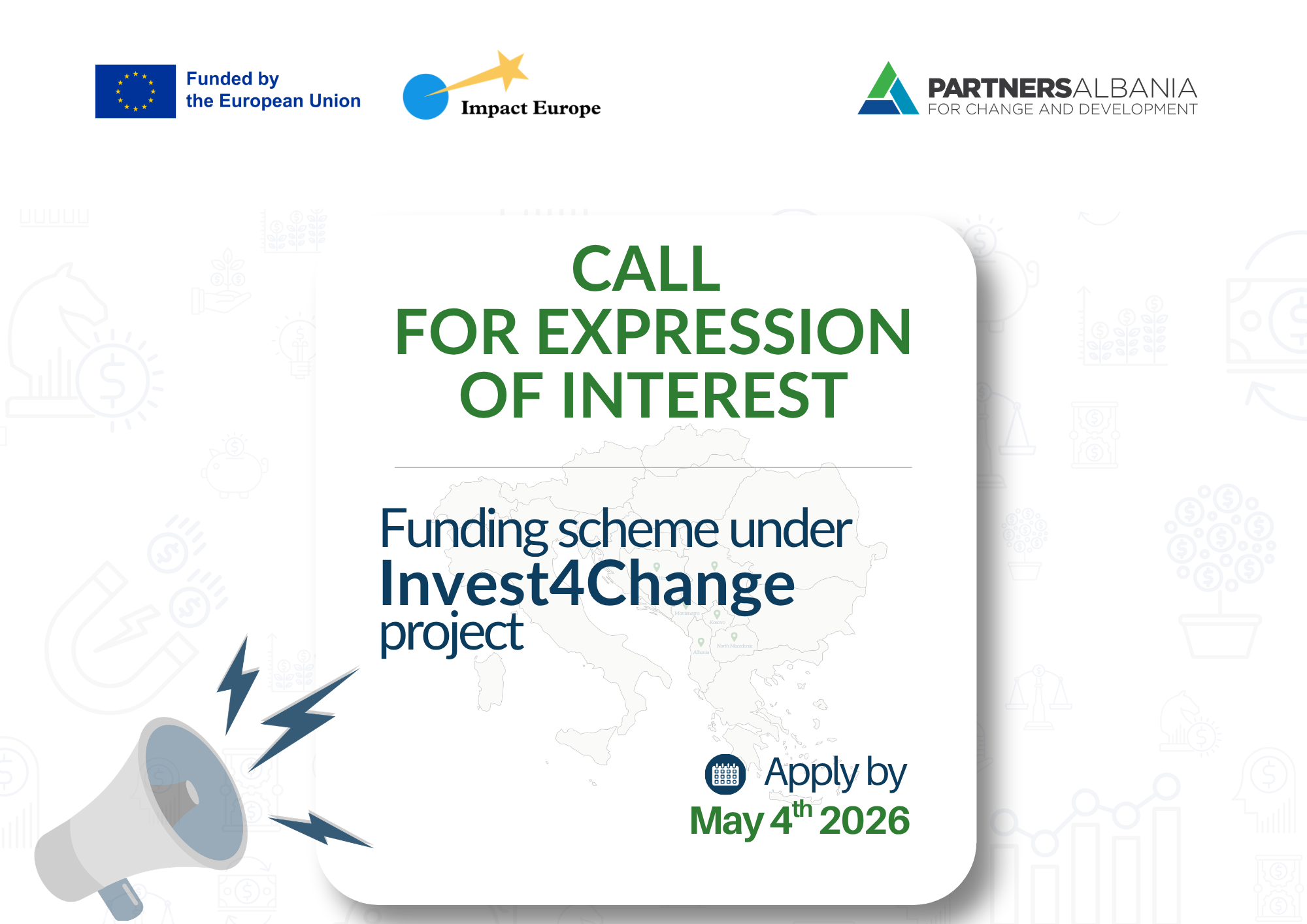 Partners Albania for Change and Development announces the Open Call for Expression of Interest within the sub-granting scheme of the project “Invest for Change- “I4C”, a four-year (2025 -2029) EU funded project that aims to strengthen economic and social development by fostering financial and social inclusion; promoting impact investment; promoting green and digital transition and investing in social enterprises.
