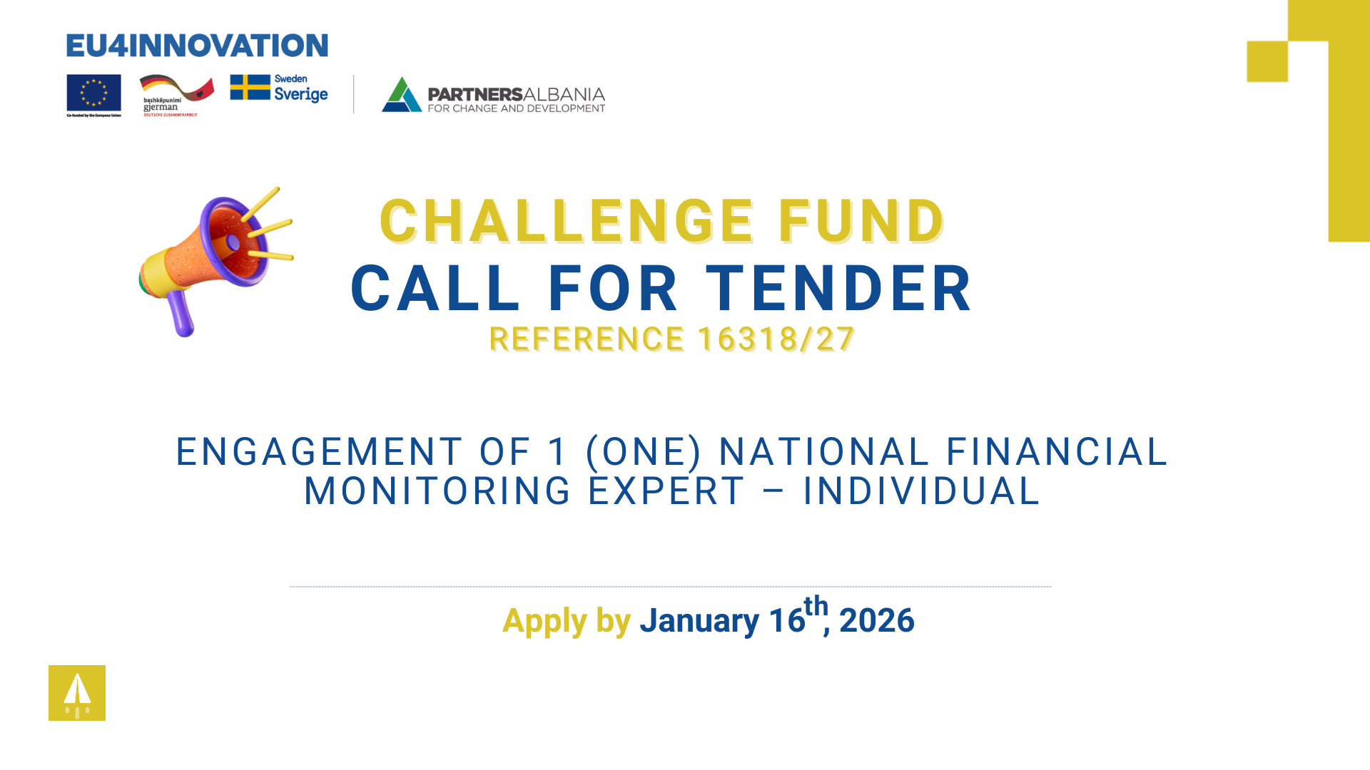 Call for Tender “Engagement of a National Financial Monitoring Expert – Individual, under Challenge Fund, EU4Innovation 2023-2026 Project” – Reference 16318/27